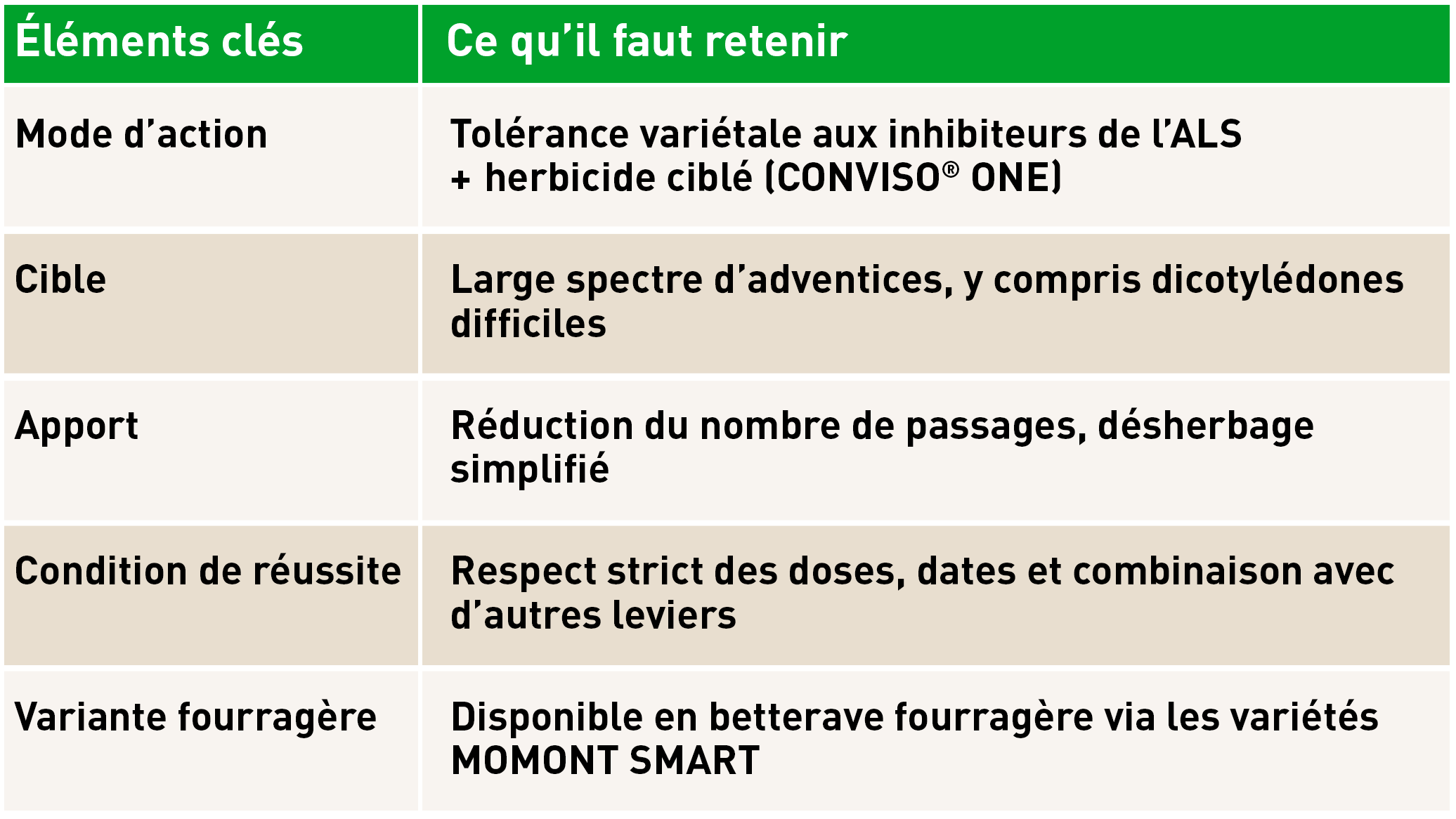 Ce système repose sur l'utilisation de variétés de betteraves fourragères sélectionnées pour leur tolérance aux inhibiteurs de l'ALS (Acetolactate Synthase), la cible de l'herbicide CONVISO® ONE. Cette tolérance permet à la culture de résister à l'herbicide, tandis que les adventices, sensibles à ce mode d'action, sont efficacement éliminées.