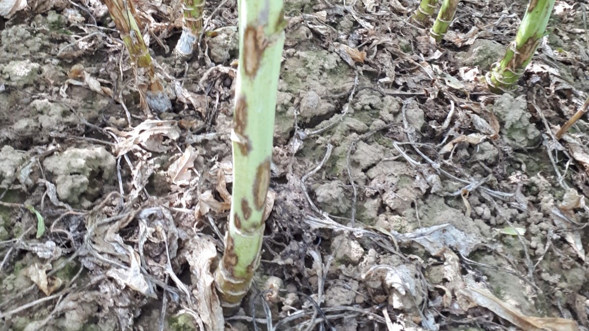 - Sur tiges : Taches allongées brunes et craquelures longitudinales.